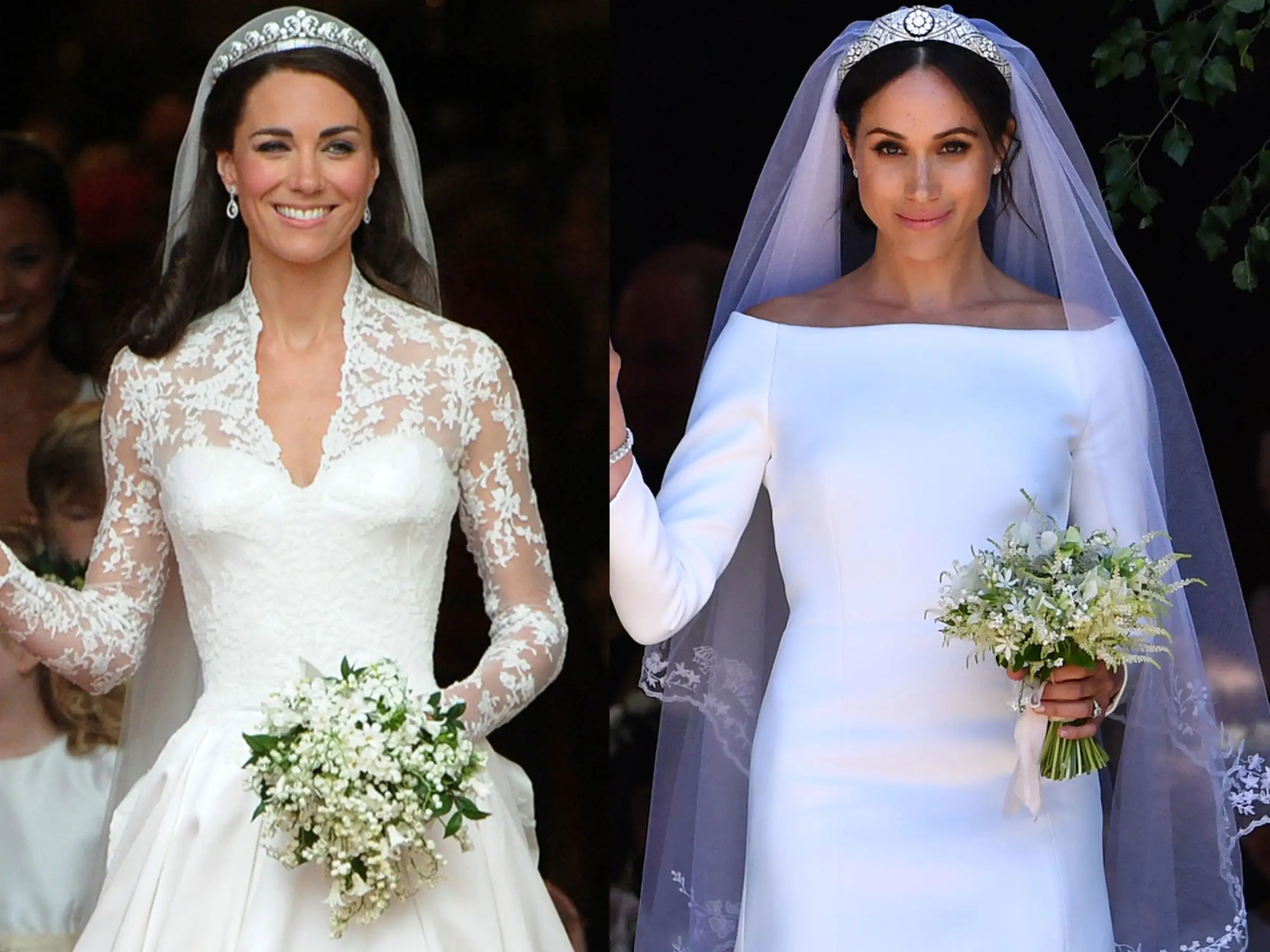 I remember way back in 2011, when she stepped out of the carriage, i. Web the wedding dress worn by meghan markle at her wedding to prince harry on 19 may 2018 was designed by the british fashion designer clare waight keller, artistic director of the fashion house givenchy.the bride's veil was embroidered with flowers representing the countries of the commonwealth; Web for her wedding to prince william in april 2011, kate middleton borrowed the cartier halo scroll tiara, which is platinum and set with diamonds dating back to 1936, from queen elizabeth ii.